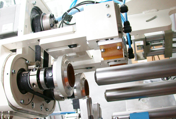 If the tubes have already been printed and painted, decoration must not be damaged during transfer. As carefully as possible, the conveyor belt takes the tubes off the chain pins, fixes them on the star wheel by vacuum and finally pushes them onto the mandrels of the big mandrel plate. The speed of conveyor, star wheel and mandrel plate are perfectly matched..